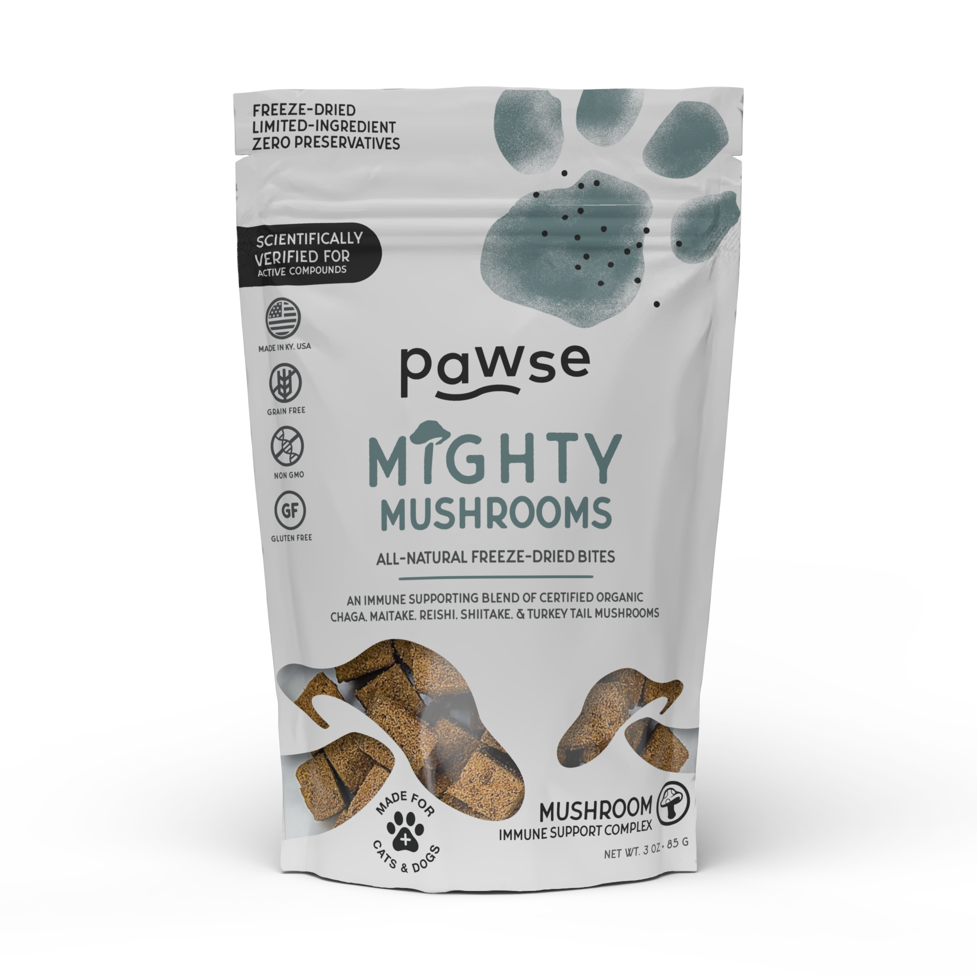 An immune boosting complex of functional mushrooms, organically cultivated and naturally grown, concentrated into a form that provides antioxidant and immunity benefits. These mushrooms are all known to be anti-inflammatory, anti-histamine and support a healthy immune system. We combine them with our all-natural fish recipe for an extremely healthy freeze dried bite your pet will crave, and you will feel great about giving them.